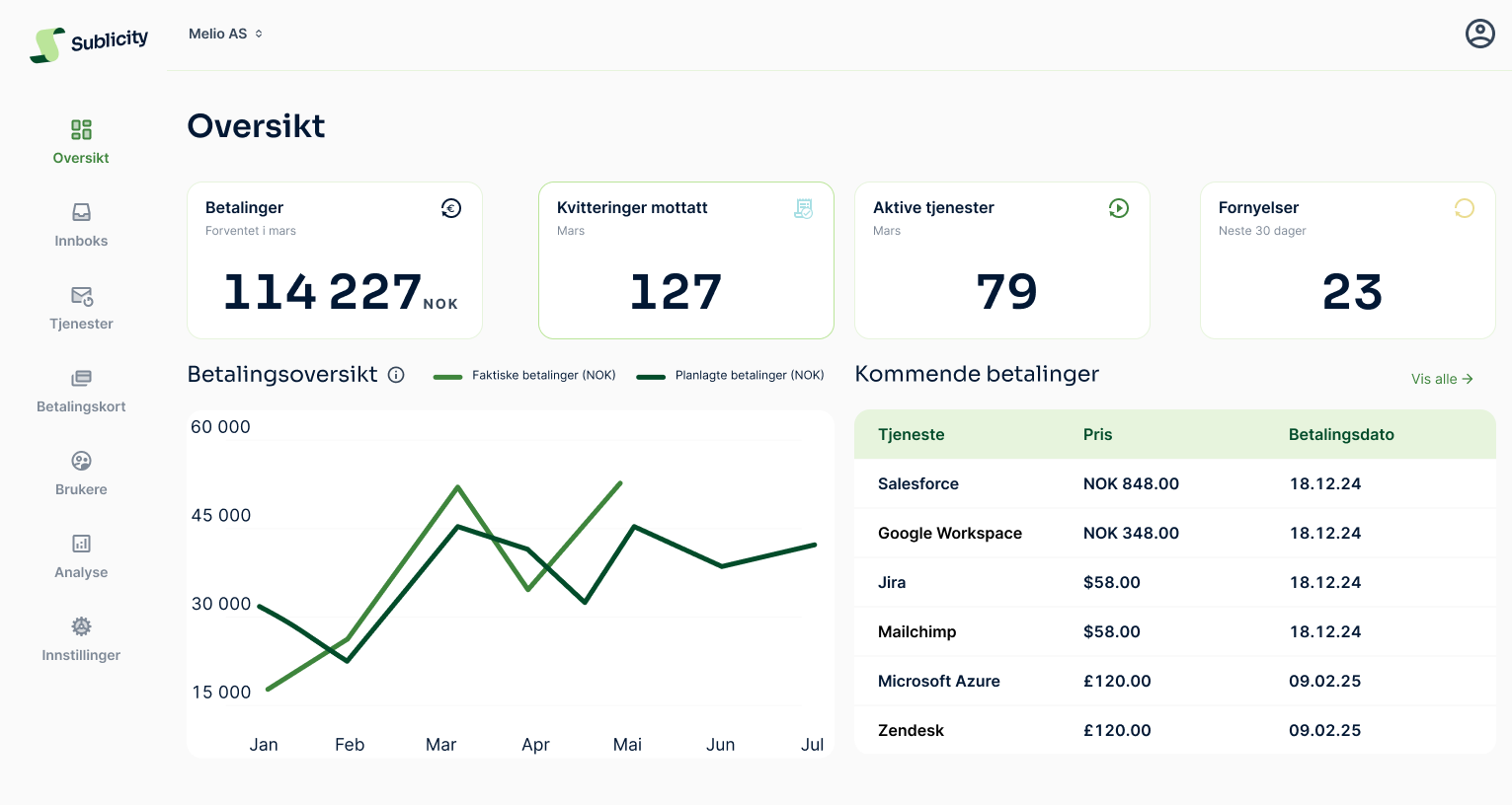 Med Sublicity har vi fått mye bedre kontroll på tjenestene og kostnadene våre. Vi kaster bort mindre tid på kvitteringsjakt og har allerede spart penger på å avslutte tjenester vi ikke trenger.